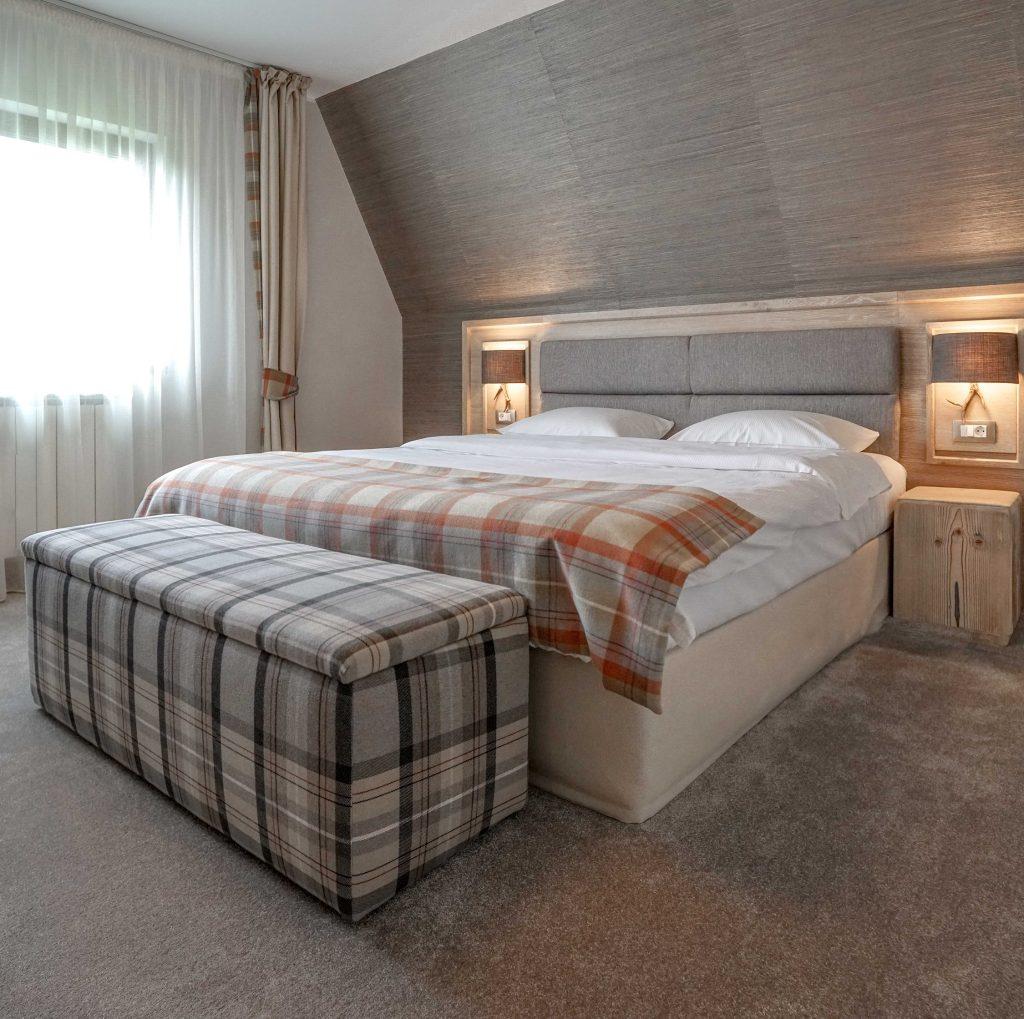 • Suită 1 dormitor: 27 m², capacitate 2 adulți și 2 copii (pat dublu + canapea extensibilă 2 locuri). Tarif: 850 lei/cameră. Notă: 2 unități disponibile la această categorie (una cu balcon, una fără balcon).